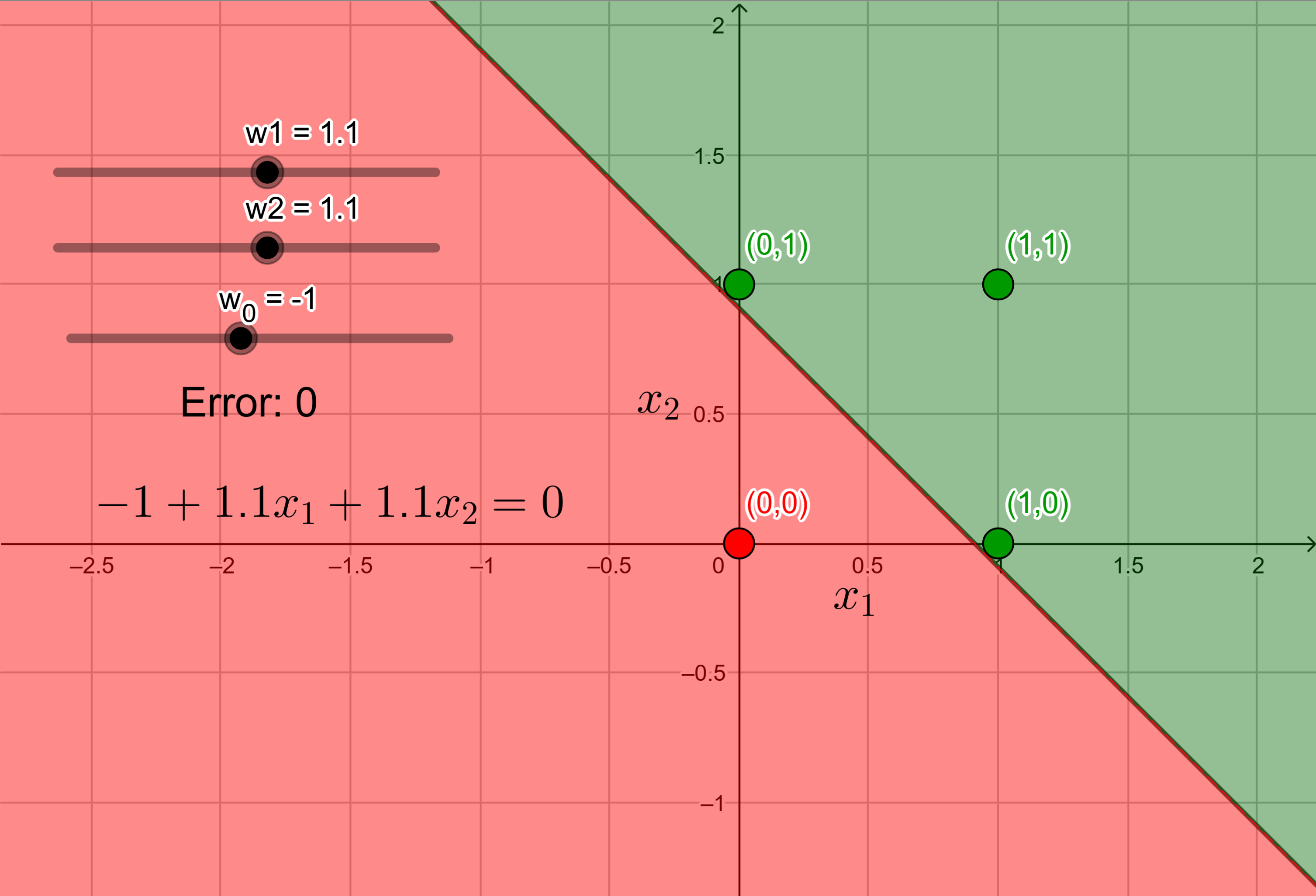 | \(0\) | \(0\) | \(0\) | \(w_0 + w_1 x_1 + w_2 x_2 < 0\) |
